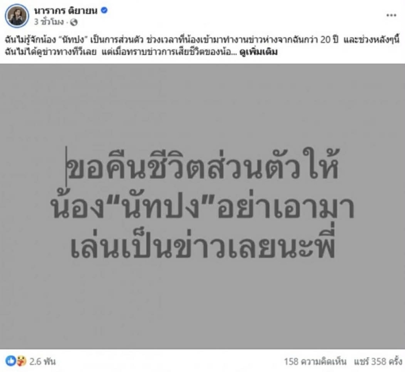 เรียกได้ว่า เป็นโพสต์ที่ทำให้วงการสื่อสะเทือนอีกครั้ง เมื่อ ต๊ะ นารากร ติยายนต์ ผู้ประกาศข่าวมากประสบการณ์ ออกมาแสดงจุดยืนผ่านเฟซบุ๊ก นารากร ติยายน พร้อมเตือนสื่อ หรือ เพจดังต่างๆ ให้ระมัดระวังการนำเสนอกรณีการเสียชีวิตของ นัทปง หรือ ณัฐวุฒิ ปงลังกา นักข่าวที่ถูกพบเสียชีวิตในบ้านพักย่านบางกรวย วันที่ 30 พฤศจิกายน โดย เธอ ย้ำว่า ความไวต่อเนื้อหาต้องควบคู่ไปกับความรับผิดชอบ